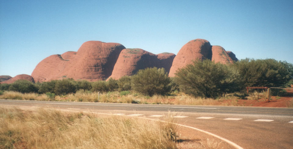 Am folgenden Tag fahren wir die vorerst letzten 370 Km auf Teerstraßen, denn ab Laverten beginnt die Great Central Road, die aus 1500 km Schotter- und Sandpisten besteht. Aufgrund der großen Entfernungen zwischen den Roadhaeusern werden zum ersten Mal die Motorräder aus den mitgenommen Benzinkanistern gefüllt. Die ersten hundert Kilometer Piste sind für mich sehr gewöhnungsbedürftig, da das Vorderrad oder das Hinterrad öfter mal wegrutscht. Aber man gewöhnt sich bekanntlich an alles. Nach 470 Km Schotterpiste ist dann auch das erste Buschcamp angesagt. Mit einen strahlend blauen Himmel beginnt der nächste Tag. 400 Km Piste sind für heute angesagt. Auf halben Wege müssen wir ein großes Wasserloch umfahren, dabei gerate ich mit meinen Vorderrad in eine von Autos erstellten Schlammfurche und verliere das Gleichgewicht. Der erste Umfaller ist dann nur noch reine Formsache. Am spaeten Nachmittag erreichen wir die Giles Meteroloical Station. Dort erlaeutert man uns wie das Wetter in Australien ermittelt wird. Anscheinend ist ein Besuch von Motorradfahrern dort sehr selten, so das wir einige Stunden Rede und Antwort stehen müssen und von uns zum Schluss auch noch Bilder gemacht werden. Der Tag wird wieder mit einem Buschcamp beendet. Bis zum Ayres Rock sind es nur 330 Km, die es aber “in sich haben”. Den die Great Central Road wechselt ihren Belag nun Kilometerweise von guten Schotter über steinigen Belag zu tiefen sandigen Untergrund. Auch Wasserlochdurchfahrten werden immer öfter gefordert. Leider habe ich wieder Schwierigkeiten bei einer der Wasserdurchfahrten, so das ich auf meinen Konto zwei weitere Umkipper zu verzeichnen habe. Einen Kulturschock bekommt man bei der Durchfahrt von Dockriver, einer Auboriginiestadt. Lauter Betrunkene Auboriginies und Müll liegen auf den Straßen herum. Wir besichtigten noch die Lassiter Cook, wo der berühmte Pionier Lassiter sein Leben ließ.