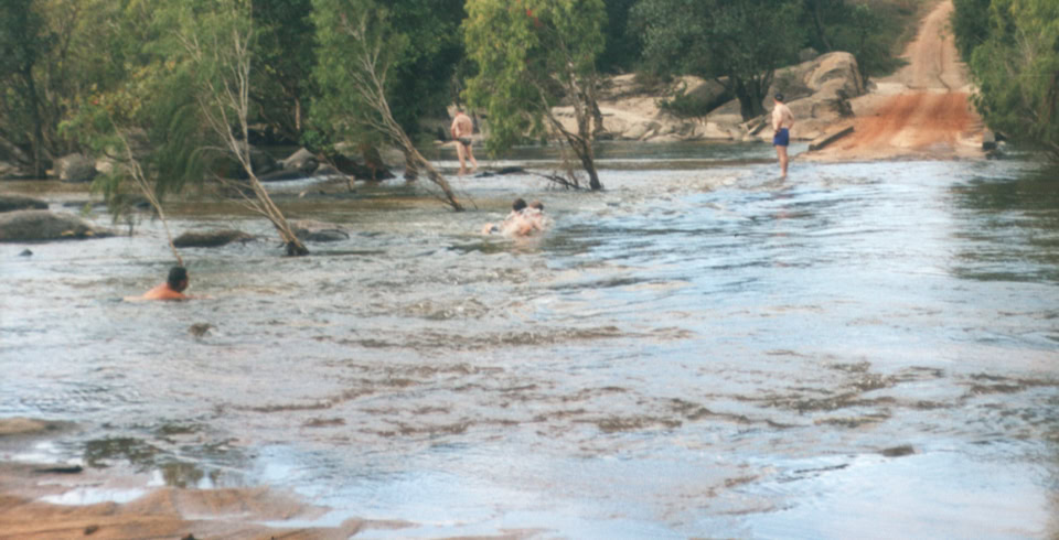 Bei den Tinaroo Falls wird wieder ein Tag Pause eingelegt um das umliegende Atherton Tableland zu erobern. Das kühle Hochland ist nicht nur ein Zentrum der Landwirtschaft, sondern hier sind auch noch Reste tropischer Regenwaelder erhalten. Wir besuchen die Wasserfaelle von Millaa Millaa, bummeln durch die Ortschaft Atherton und Marlanda und genießen die kurvenreichen Straßen. Den Abend beenden wir als Samariter, denn eine Familie aus Hamburg hat sich ausgesperrt. Wir helfen Ihnen beim Aufbrechen ihres Caravan. Der folgende Tag ist für uns der Startschuss auf den Weg zum Cape York. Bis Lakeland ist die Straße noch Asphaltiert, danach beginnt die Peninsula Devel Road mit all ihren Tücken. Faustgroße Steine, riesige Schlaglöcher und vor den Motorraeder springende Kaelber erfordern größte Aufmerksamkeit um Stürze zu vermeiden. Dann beginnen die “Dips”, ein plötzliches Absinken der Road mit teilweise meterbreiten Wasserlöchern. Nach der ersten Begegnung bin ich von oben bis unten durchnaesst. Doch man lernt schnell. Auch den ersten Plattfuss haben wir zu vermerken. Am Abend legen wir wieder ein Buschcamp am Kennedy River ein. In der Nacht sehe ich so viele Sternschnuppen, das ich mit den Wünschen nicht mehr nachkomme. Das Endziel des folgenden Tag heißt Archer River Roadhouse, aber bis dorthin haben wir zahlreiche Flussdurchquerungen, einige sogar bis zu 40 cm tief, zu taetigen. Auch die Wellblechpiste macht unseren Motorraeder ganz gut zu schaffen. Bei mir faellt der Blinker ab, bei Beat versagt der Vergaser und Ad hat Probleme mit seiner Zündbox. Die Durchquerung des Archer River am naechsten Morgen bereitet uns weniger Probleme als angenommen. Obwohl er an der tiefsten Stelle ca. 50 cm tief ist, können wir mit den Motorraedern problemlos durchfahren. Nach ca. 50 km biegen wir rechts auf die Telegraph Road Richtung Bamaga ab. Laut den Hinweisschildern ist es bis zum “Top End” nur noch 350 Km weit. Doch für uns ist das Ziel nicht erreichbar, denn der Wenlock River weist einen Wasserstand von 160 cm auf. Für die Motorraeder waere das kein Problem. Man könnte sie mit einen Boot herüber bringen. Doch unser Begleitfahrzeug ist nur für Wassertiefen bis zu 100 cm eingerichtet. Nach einigen Diskussionen heißt es Umkehren. Unser neues Tagesziel heißt Weipa. Am spaeten Abend angekommen lassen wir uns erst mal vollaufen, denn der Frust ist groß. “Weipa” ist ein Zweitausendfünfhundert Seelen Ort und verdankt seine Existenz dem Aluminium. In Weipa wird die einfachste Aluminiumgewinnung betrieben, und zwar im Übertageabbau. Wir nutzen die Möglichkeit bei einer geführten Rundfahrt die Stadt und den Aluminiumabbau zu besichtigen. Am meisten beeindrucken uns die riesigen Lkw mit einem Zuladungsgewicht von 100 Tonnen. Einer dieser Lkw kostet 1,5 Millionen Dollar, ein Reifen kostet 10000 Dollar und sie verbrauchen 90 Liter/h. Nach der dreistündigen Besichtigung gehen wir erst mal in der Stadt bummeln und anschließend erfrischen wir uns im Swimmingpool.