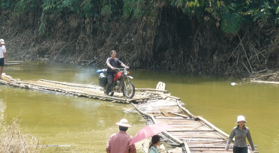 Der heutige Tag sollte der anstrengendste Fahrtag meiner Motorradkarriere werden. 130 Km sind angesagt, davon 80 km Off Road. Einige der Mitfahrer zweifeln von vornherein daran das wir die komplette Strecke schaffen werden, doch unser Tourguide tönt das er die Tour in drei bis vier Stunden schaffen würde. Der Tag beginnt um 8 Uhr mit einer angenehmen Flußfahrt auf den Nang River. Für die ca. 20 Km lange Flussstrecke benötigt die „Fähre“ ca 2 Stunden. Kaum haben wir unsere Motorräder abgeladen empfängt uns sofort eine Steigung die es in sich hat. Nur mit vereinten Kräften überwinden wir die Schlammartige und durch Furchen gepflasterte Steigung. Ich möchte hier nicht die nächsten Strapazen beschreiben, denn das ist sowie nicht möglich. Ich kann nur sagen das wir für ca. 41 Km etwa 12 Stunden gebraucht haben. Irgendwann auf der Stecke bin ich nur noch sitzen geblieben und habe gesagt das ich völlig ausgelaugt bin und ich keinen Meter mehr weiterfahren werde. Notgedrungen konnten wir bei einer netten Familie (ich bin ihr heute noch sehr dankbar), die in einer Holzhütte von ca 30 Qm mit drei Generation lebte, auf den Lehmboden übernachten. Schnell wurde ein Huhn geschlachtet und in einer Kochnische ( bestehend aus einer Feuerstelle mit Gusstöpfen) eine kleines Mahl für uns zubereitet. Nach dem Essen vielen wir nur noch alle auf unsere Schlafsäcke um uns von den Strapazen zu erholen. Am nächsten Tag fahren wir nur noch 30 Km bis zur nächsten größeren Ortschaft Bac me, um dort einen ungeplanten Ruhetag einzulegen. 15 Stunden Nonstop schlafen war angesagt.