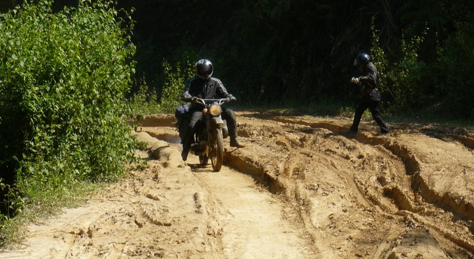 Heute geht es nun weiter in Richtung Norden auf dem alten Highway No.5 über viele kleine Bergstraßen, die am besten nur mit dem Bike , Pferd oder Ochsenkarren befahrbar sind, nach Thung Man. In diesem Gebiet leben viele unterschiedliche Volksgruppen die ein einfaches Leben führen und nur von Trockenreis, Gemüseanbau und Jagen im Wald leben. Das Wort Straße beginnt von nun an für uns eine neue Bedeutung zu bekommen. Es ist einfach nur ein Feldweg der übersät ist mit Schlaglöchern, Schlammlöchern, Auswaschungen, Schottersteinen, Kuhscheiße usw.. Nachdem wir die ersten Hürden genommen haben, stoßen wir nun auch auf die ersten kleinen Problemen mit unseren Minsk die uns bis zum Ende der Tour kontinuierlich begleiten werden. Fußrasten die Abbrechen, Kupplungszüge die Reißen, Handhebel die durchs Stürzen abbrechen und Schaltungen die nicht mehr funktionieren. Auch verliert manchmal unser Tourguide die Orientierung und führt uns in die falsche Richtung, die dann manchmal in tiefen Schlamm und Morast enden. Plötzlich zieht sich der Himmel zu und es fängt Monsumartig an zu regen. Der bis dato eigener maßen befahrene Weg entwickelt sich in Minutenschnelle zu einer schlammartigen Rutschpartie. Bei einer Durchquerung einer Spurrille verliert Norbert die Kontrolle über seine Fahrzeug und fällt unglücklich auf seine linke Hand. Diese schwillt zu einen Fleischklumpen Artigen Gebilde an. Nur noch mit Schmerzen schafft es Norbert bis zu unseren Endziel, das kurzerhand von unseren Tourguide von einen Homestead zu einem Hotel umgewandelt wurde. Der Abend wird damit verbracht die Blessuren zu verarzten und die nassen Sachen zu trocknen. Unglücklicherweise zogen sich einige Leute auch noch einen Durchfall zu.